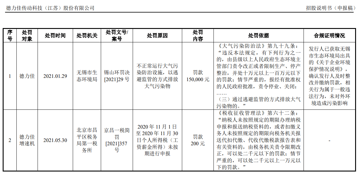 市昌平区税务局第一税务所于2021年5月30日做出京昌一税简罚[2021]357号惩罚。因德力佳增速机2020年11月1日至2020年11月30日小我所得税(工资薪金所得)未按期进行申报,罚款200元。