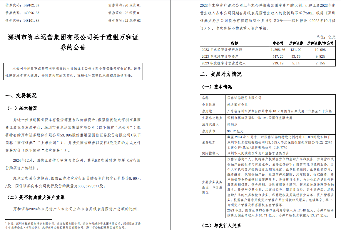 为进一步鞭策国有本钱存量资本整合和价值提拔,做强做优做大深圳市属国资证券营业成长平台,深圳市本钱运营集团无限公司拟将持有的万和证券股份无限公司53。09%股份沉组至国信证券股份无限公司,并接管国信证券以刊行A股股票的体例领取买卖对价(下称“本次买卖”)。2024年12月,国信证券做为甲方取本公司、其他6名买卖对方签订《刊行股份采办资产和谈》。经本次买卖各方协商,国信证券本次刊行股份采办资产的刊行价钱为8。60元/股,国信证券向本公司刊行股份的数量为333,579,571股。截至2023岁暮,万和证券经审计的母公司净资产账面价值为53。98亿元;截至2024年6月末,万和证券经审计的母公司净资产账面价值为53。78亿元。2023年度,万和证券的归并口径利钱净收入为2,933。24万元、归并口径手续费及佣金净收入为1。82亿元、归并口径投资收益为1。72亿元。按照中联资产评估集团无限公司出具的《国信证券拟刊行股份采办深圳市本钱运营集团无限公司等股东持有的万和证券股份所涉及的万和证券股东全数权益价值资产评估演讲》(中联评报字(2024)第3736号),万和证券股东全数权益于评估基准日2024年6月30日采纳资产根本法的市场价值为540,370。69万元。参考上述评估成果,各方经协商分歧,同意将标的资产的买卖价钱确定为519,183。79万元。按照8。60元/股的刊行价钱计较,国信证券本次向买卖对方刊行股份的数量合计为603,702,080股。