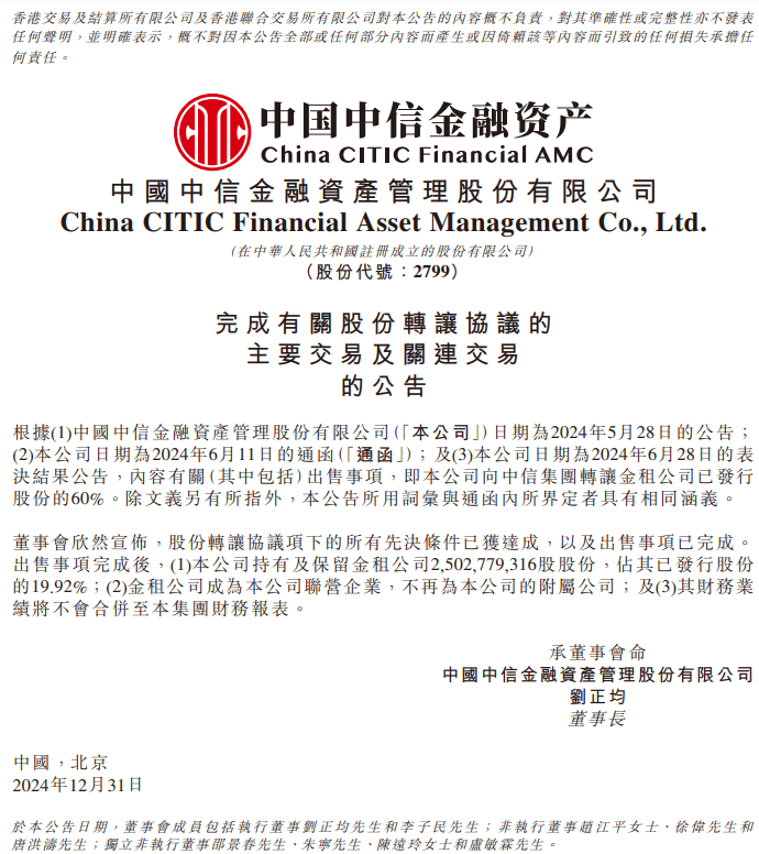 中信金融资产(02799)发布通知布告,股份让渡和谈项下的所有先决前提已获告竣,以及出售事项已完成。出售事项完成后,公司持有及保留金租公司25。03亿股股份,占其已刊行股份的19。92%;金租公司成为公司联营企业,不再为公司的从属公司;及其财政业绩将不汇合并至集团财政报表。